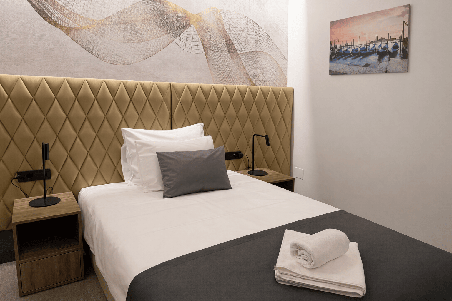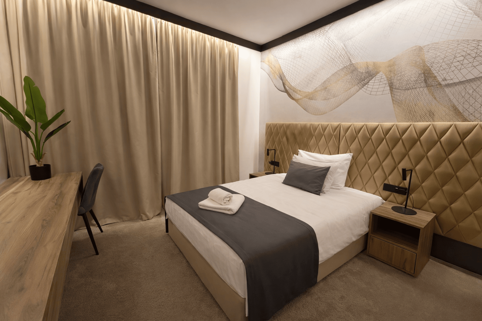 Modernly decorated double room with a king-size bed whose harmony of color and minimalism ensures a true respite and provides you with all the necessary comfort during your vacation.