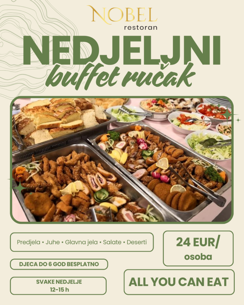 Svake nedjelje od 12:00 do 15:00 sati pozivamo vas da uživate u našem nedjeljnom buffet švedskom stolu. Pripremili smo raznovrsna jela za svakoga – od juha, svježih salata i toplih predjela, do glavnih jela i slastica. ✨ Neograničeno uživanje – „jedi koliko želiš“💶 Cijena: 24 € po osobi👶 Djeca do 6 godina besplatno […]